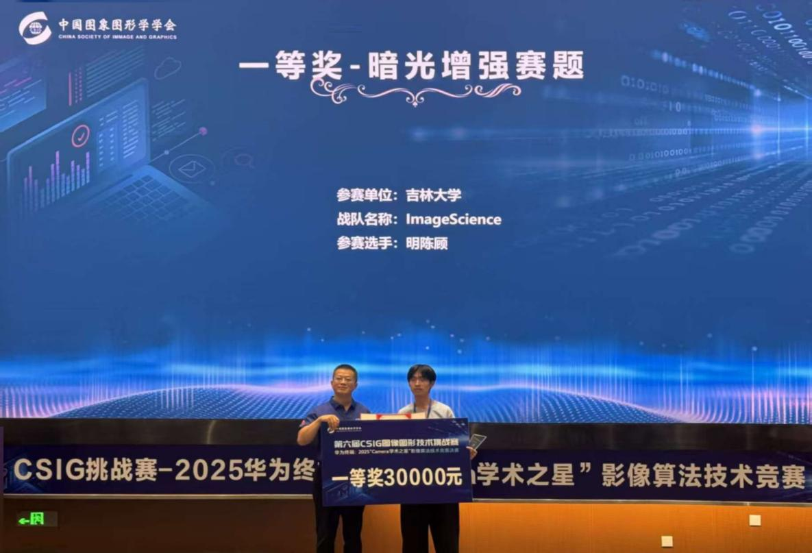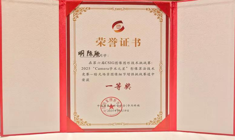 2025年10月18日至10月19日,由中国图象图形学学会主办、华为终端有限公司联合承办的第六届CSIG图像图形技术挑战赛华为终端:2025Camera学术之星影像算法技术竞赛决赛在广东东莞华为松山湖欧洲小镇举行,共20支队伍入围线下决赛。经过激烈角逐,我院研一学生明陈顾作为单人队伍,展现出扎实的专业基础和出色的创新能力,荣获暗光场景图像细节增强赛道一等奖(第一名,奖金30000人民币),指导教师为查志远教授